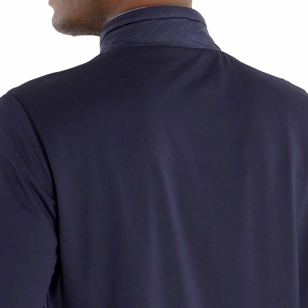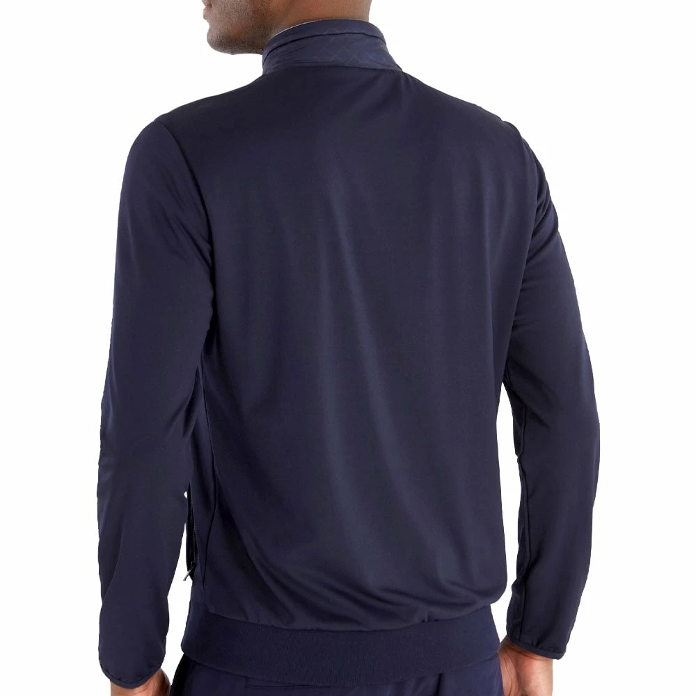 The soft, fleece backed stretch fabric at the sides, sleeves shoulders and back ensures a comfortable and snug fit. There is also knit rib inside the collar with contrast stripes, and a chunky rib knit hem at the side and back.